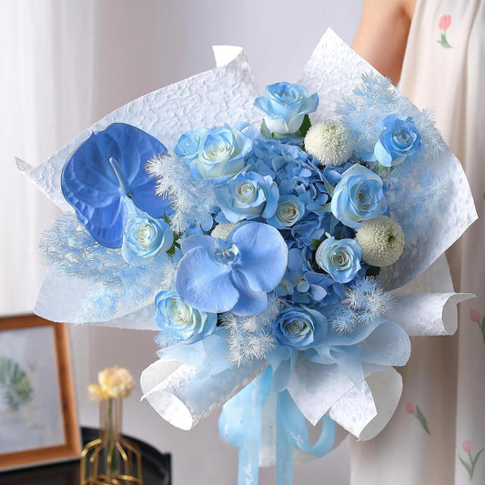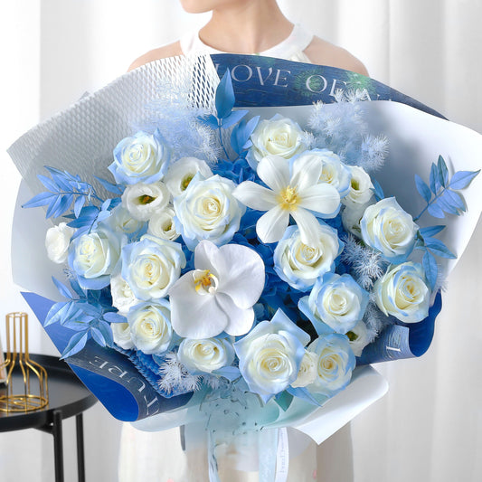 藍天白雲|碎冰藍玫瑰蝴蝶蘭藍繡球混搭鮮花束定價 HK$598.00定價單價 每-