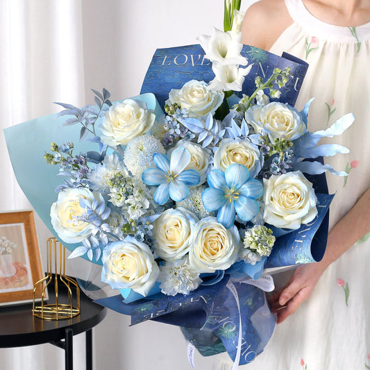 晴空萬里|碎冰藍玫瑰藍星花鬱金香混搭鮮花束定價 HK$598.00定價單價 每-