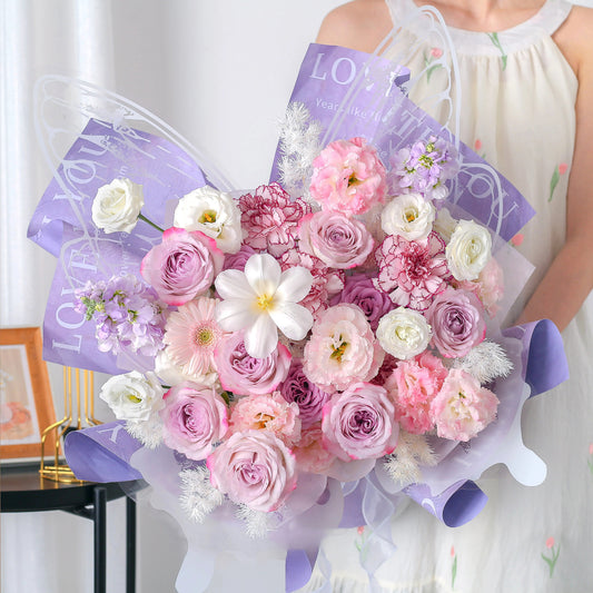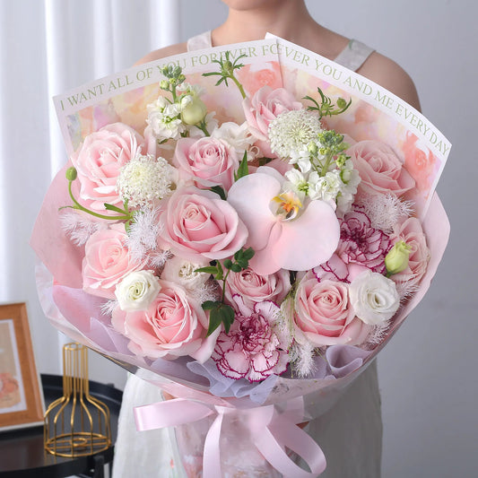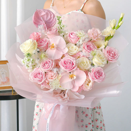 雲端夢境|粉雪山玫瑰紫精靈蝴蝶蘭混搭鮮花束定價 HK$568.00定價單價 每-