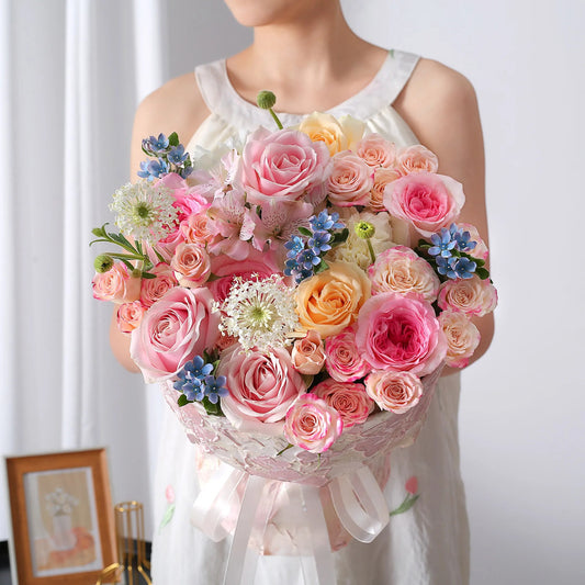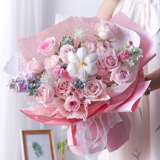 粉霧星吻|粉雪山粉水仙百合折射玫瑰混搭鮮花束定價 HK$628.00定價單價 每-