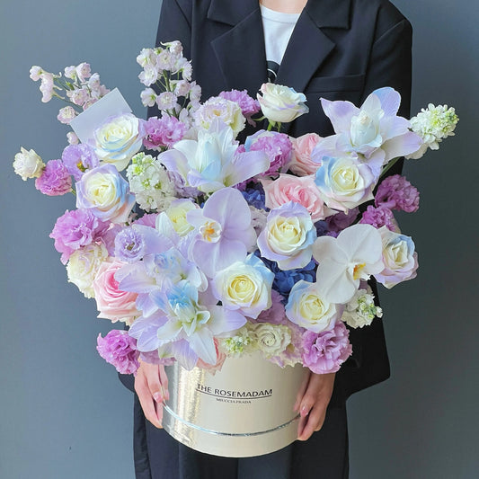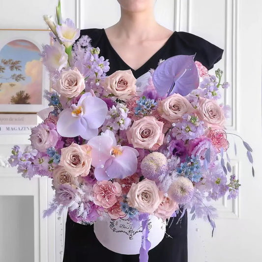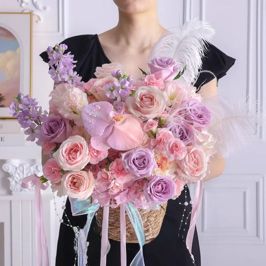 【漫舞輕盈】紫玫瑰粉雪山紫羅蘭混搭鮮花束 |手提花籃Regular price HK$858.00Regular priceUnit price per-