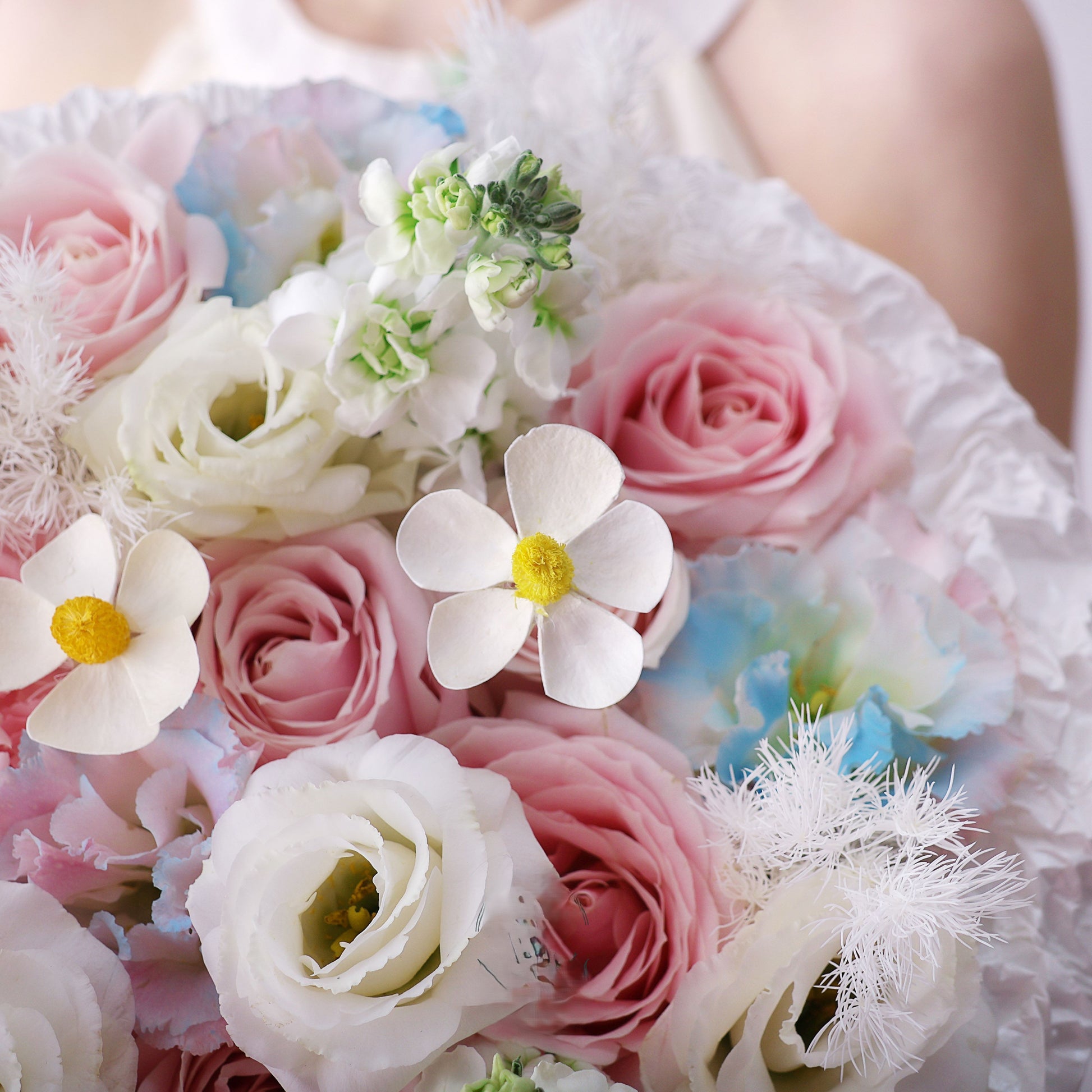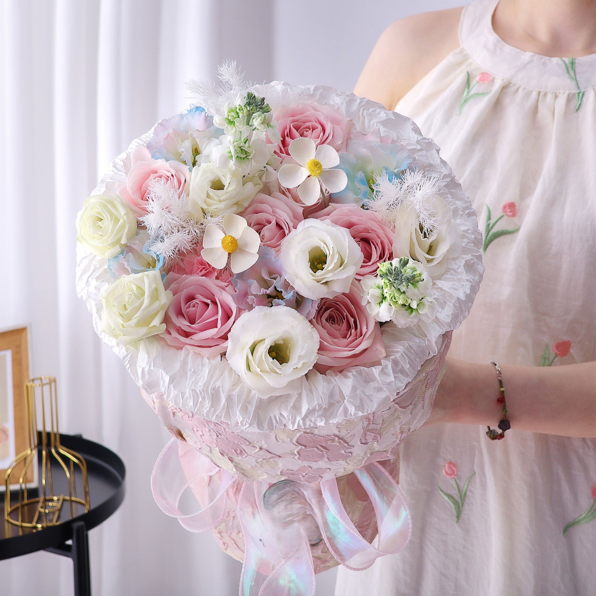小美好|粉雪山玫瑰粉色波浪桔梗混搭鮮花束