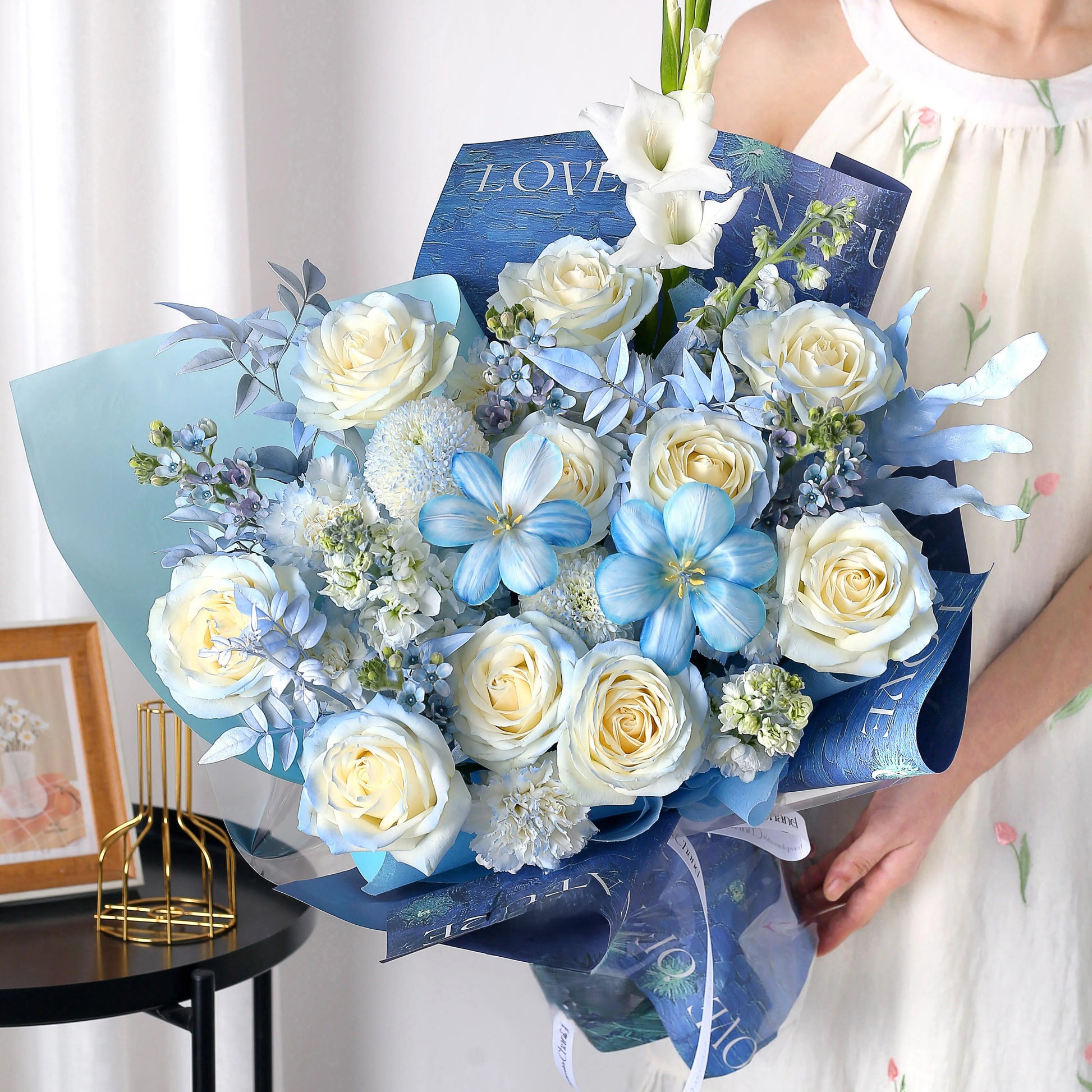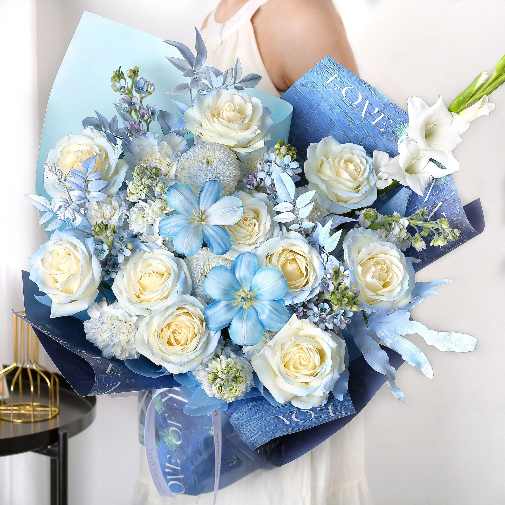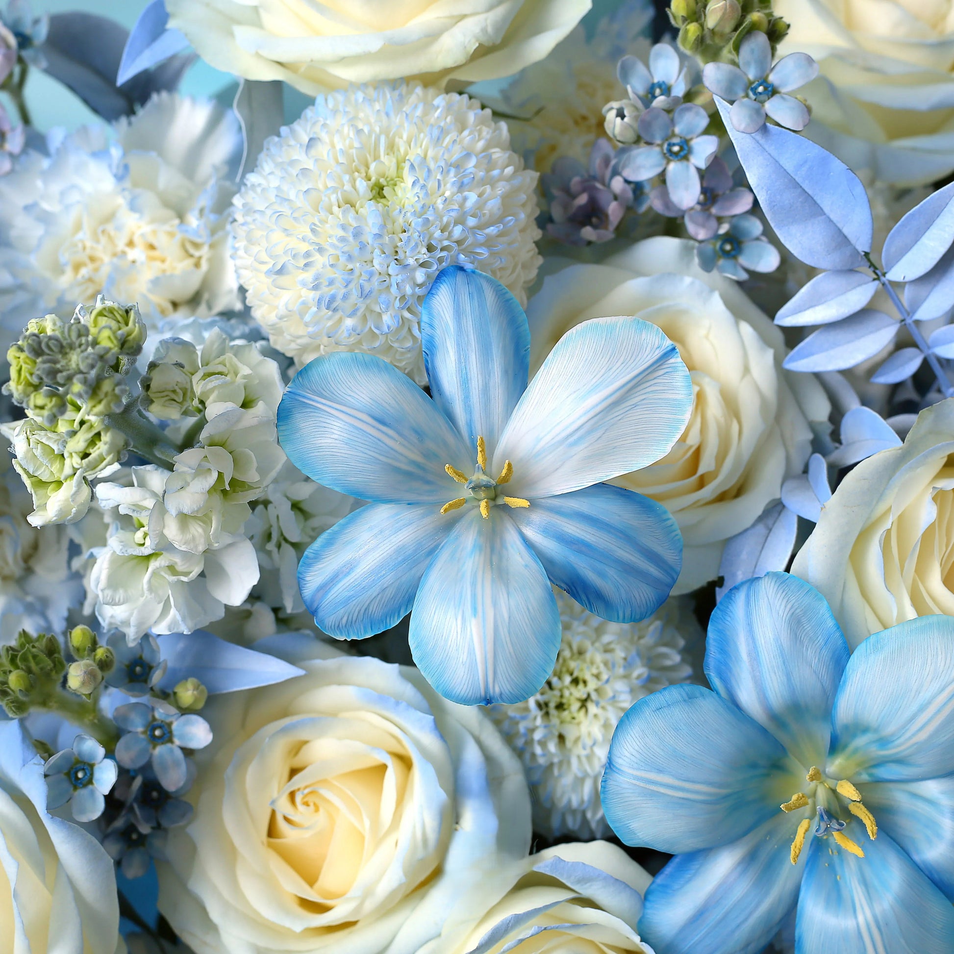 晴空萬里|碎冰藍玫瑰藍星花鬱金香混搭鮮花束